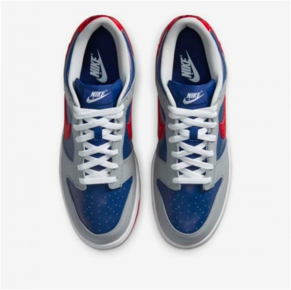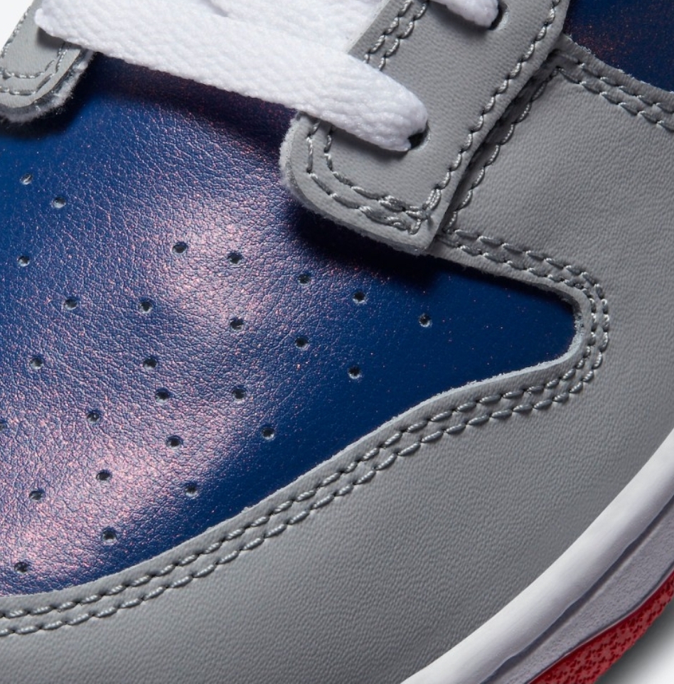 먼저 색상을보시면 삼바실버색상과 하이퍼블루 색상 레드색상이 들어가 있는 것을 보실수 있습니다. 이 삼바실버 라는 색상이 어두운 회색 계열이 아니라 약간 차가운 계열의 회색느낌 이여서 블루 색상과 조화를 잘 이루는 것 같습니다. 다른 덩크 로우 제품과 다른 디테일을 보시면 먼저 블루 색상쪽에 펄느낌이 들어간 것을 보실 수 있습니다.