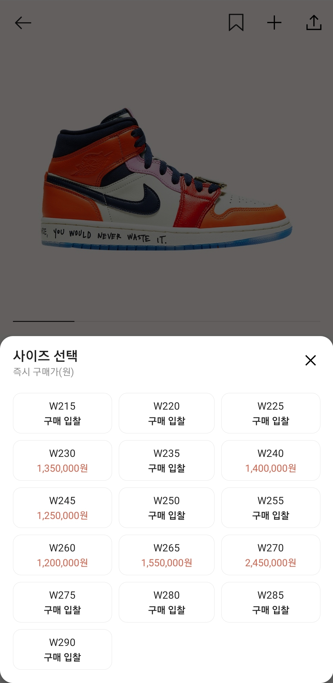 가격은 보시다 원래 발매가의 10배정도의 가격을 보실 수 있습니다. 출시때도 소량으로 나와서 현제는 매물도 별로 없는 것 같습니다. 조던1 미드로 나온 제품이지만 가격도 어마어마하고 디자인도 괜찮은 제품이어서 조던1 미드 중에서는 거의 1대장이 아닐까 싶습니다. 솔직히 가격이 너무 높아서 추천드리지는 못하지만 경제적 여유가 있으시면 디자인 적으로는 정말 괜찮은 제품이니깐 구매하셔도 후회는 안하실 제품일 것 같습니다.