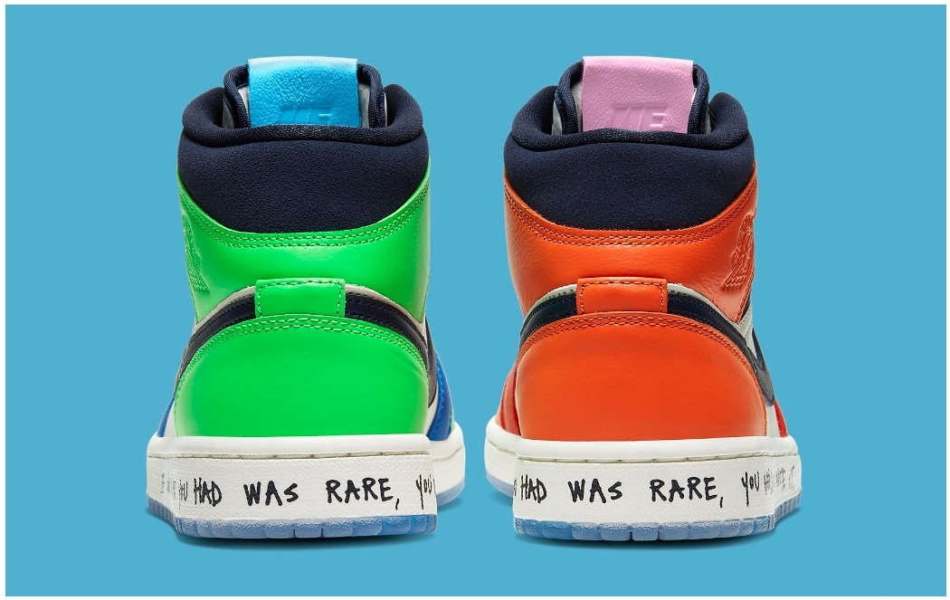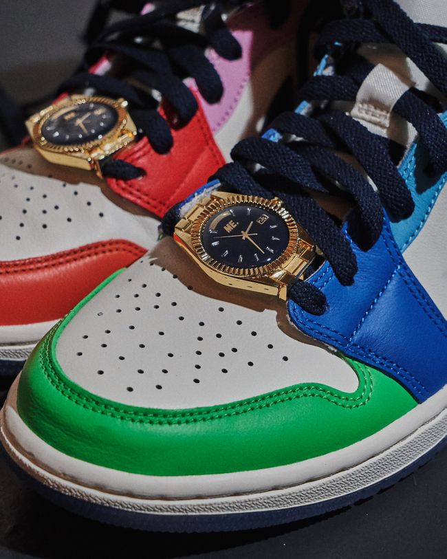 신발을 살펴보면 진짜 엄청나게 많은 디테일을 보실 수 있습니다. 일단 색상부터 보면 이제품은 양쪽이 색상이 다른 것을 보실 수 있는데요. 한쪽은 주황색, 빨간색, 분홍색이 들어가 있고 한쪽은 형광색, 하늘색, 파란색이 들어가 있습니다. 공통적으로는 하얀색과 검은색 색상이 들어가 있습니다. 디테일을 살펴보면 먼저 텅의 점프맨택을 보실수 있는데요 가죽에 조던의 점프맨 모양이 찍혀 있는 것처럼 되어있습니다. 텅의 택 색상도 한쪽은 하늘색 한쪽은 분홍색으로 되어있습니다. 그리고 가장 눈에 띄는 신발 앞쪽을 보시면 양쪽에 시계가 달려있습니다.